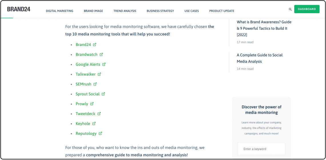 Yes, we rely a lot on content marketing ourselves. One of our tactics is to create lists of the best digital marketing tools to help editors create content. These types of articles perform great in Google and bring valuable traffic. And because the main goal of such lists is conversion, they always feature a solution from Brand24.
