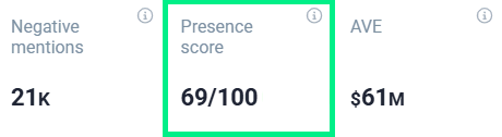 Presence Score: 69/100, meaning that Uber has been quite popular in the last 30 days