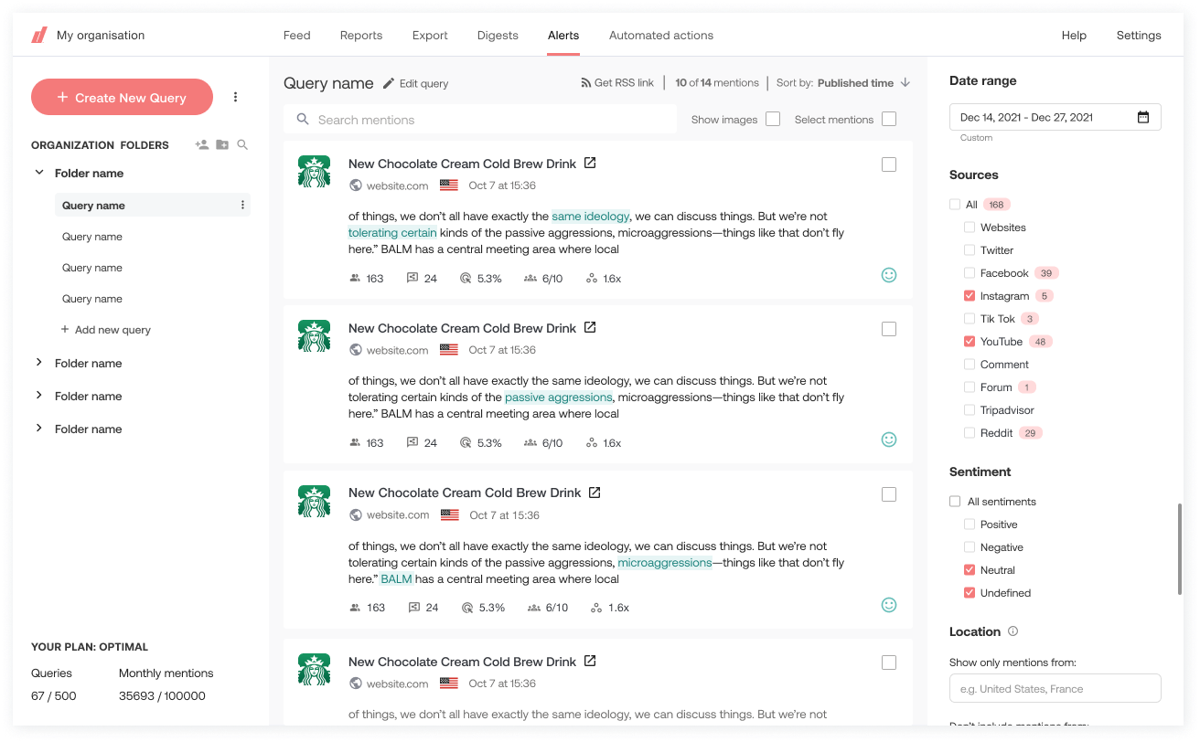 - Limited coverage – Awario users often complain about the lack of comprehensive monitoring of Instagram, LinkedIn, or Reddit