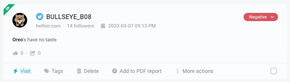 - In the last 30 days, there were about over 100k mentions of Oreo. 35k of them are positive, while 12k have a negative sentiment.