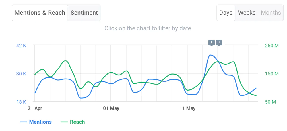You can track the highs and lows and review each mention. This makes understanding what’s getting people talking easy.