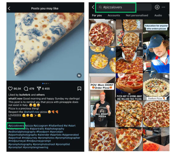 How it works? Hashtags are clickable. Users who click on a hashtag on Instagram posts or type it in a search will see a page showing content tagged with that particular hashtag: