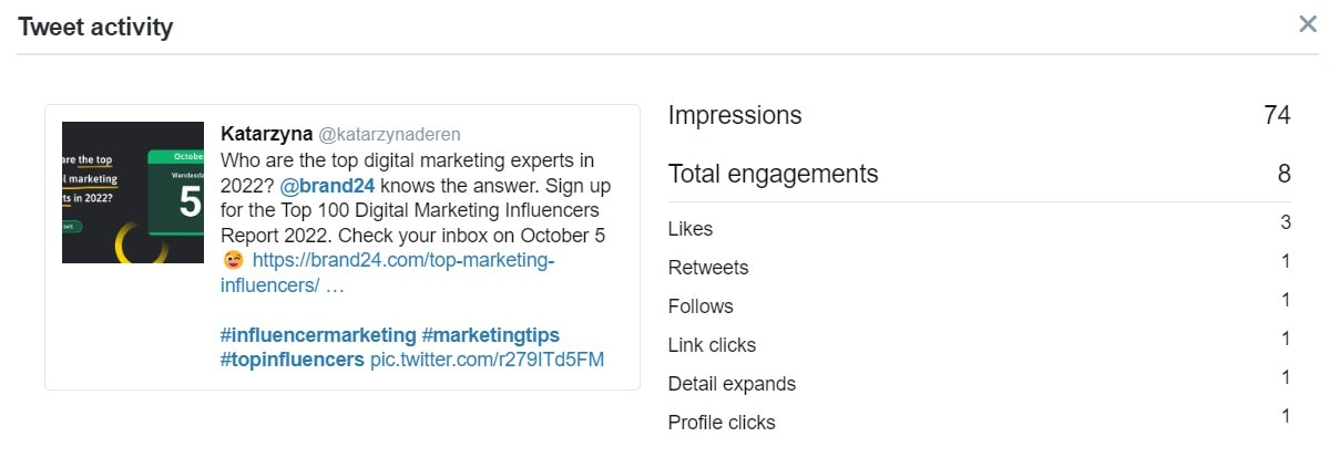 Each tweet has its own statistics that show the number of impressions, likes, retweets, follows, link clicks, detail expands, and profile clicks. You can check them in the Twitter analytics.