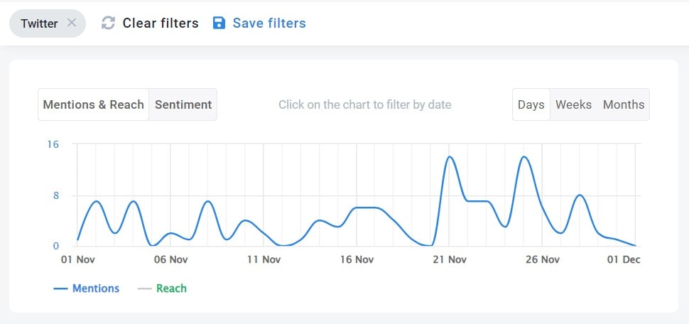 You can select a day or time range, and the tool will show you all published mentions, their social media reach, and sentiment.