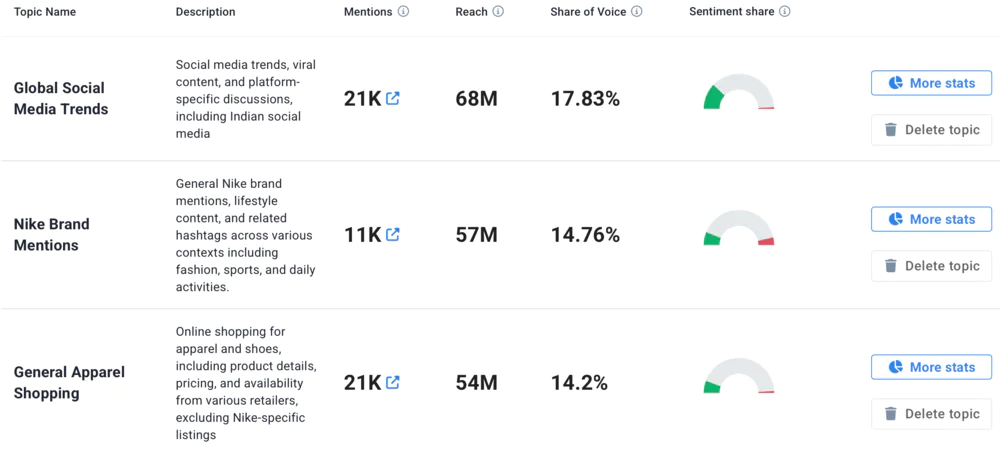 Thanks to natural language processing, it detects recurring themes in your mentions and groups them into topics with additional insights.